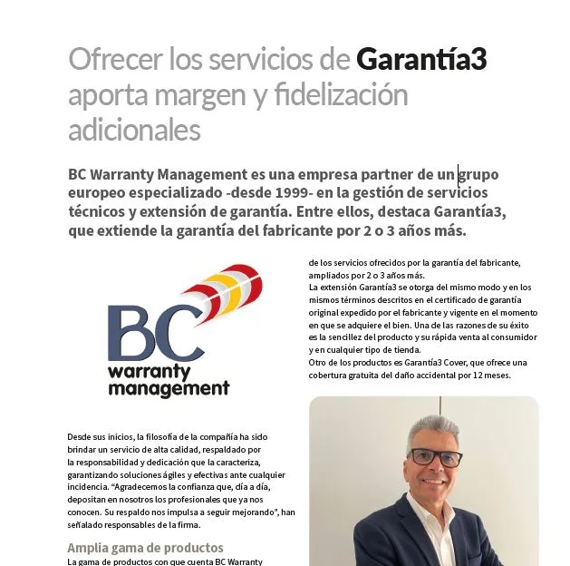 Ofrecer los servicios de Garantía3 aporta margen y fidelización adicionales BC Warranty Management es una empresa partner de un grupo europeo especializado -desde 1999- en la gestión de servicios técnicos y extensión de garantía. Entre ellos, destaca Garantía3, que extiende la garantía del fabricante por 2 o 3 años más.